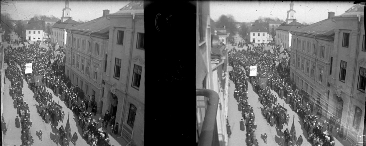 'Bildtext: ''Demonstrationer på 1 maj.'' :: Gatuvy med demonstrationståg med plakat med texten ''BRÖD''. Vy med folksamling och hus. Ev. kyrka. :: :: Ingår i serie med fotonr. 5261:1-14. Se även hela serien med fotonr. 5237-5267.'