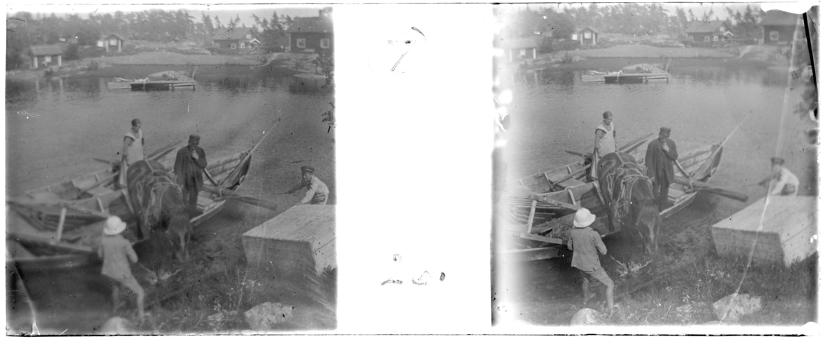 'Bildtext: ''Häst i roddbåt.'' :: I förgrunden 2 roddbåtar där en häst håller på att lastas av från en båt och in till land. I den andra båten står en kvinna, i båten med hästen står 1 man och på land ytterligare 2 personer. Hästen har seldon på sig. Vy med hav och på avstånd, på andra sidan, hus. :: :: Ingår i serie med fotonr. 5262:1-16. Se även hela serien med fotonr. 5237-5267.'