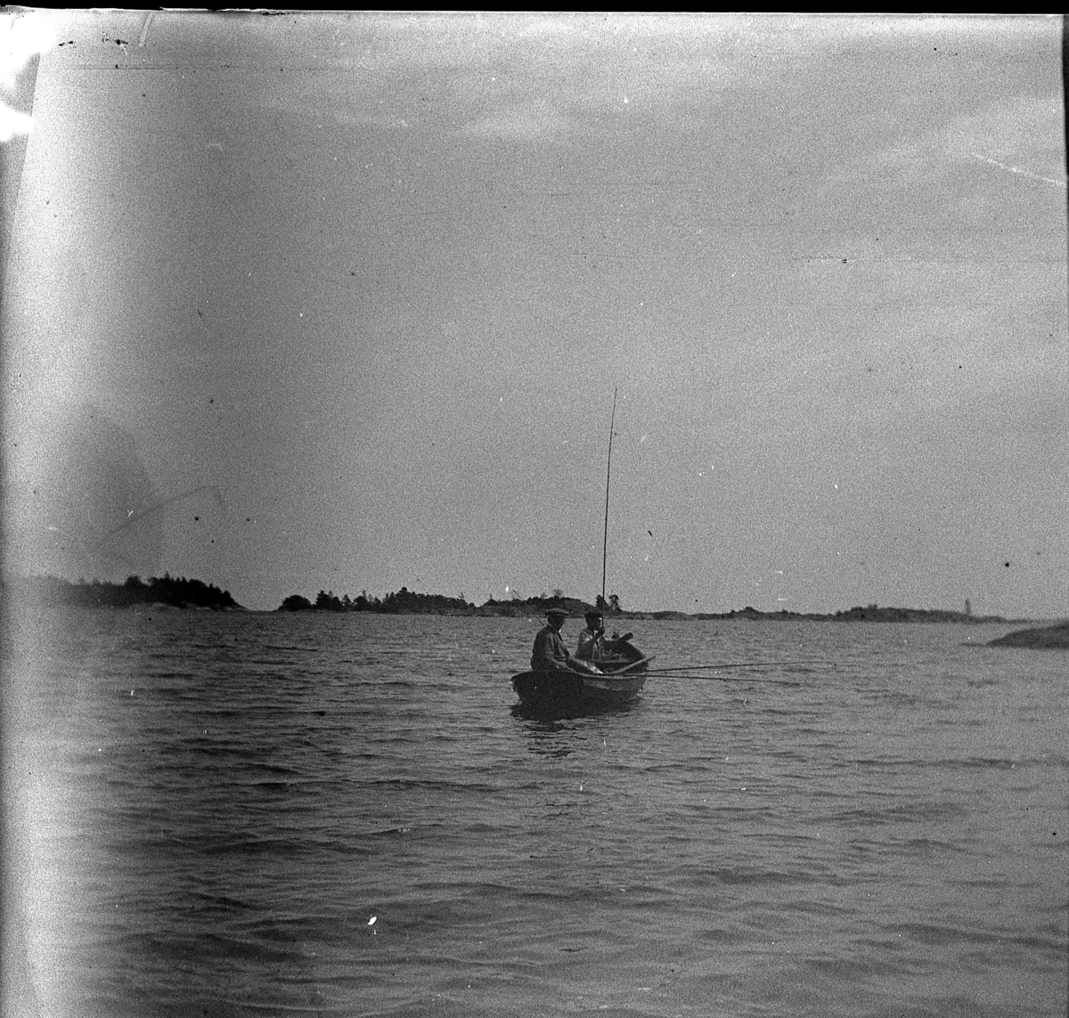 'Bildtext: ''J.E. Frykberg och Bengt, metande.'' :: Vy med 1 roddbåt med 2 män ombord, med metspön. :: :: Ingår i serie med fotonr. 5262:1-16. Se även hela serien med fotonr. 5237-5267.'