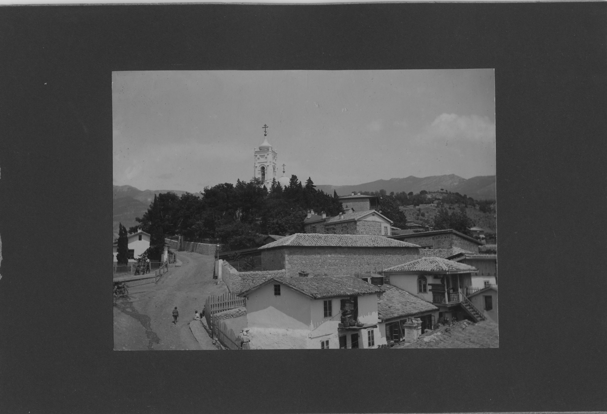 Vy över del av ev. by med bygata och hus. På avstånd kyrkbyggnad och i fonden berg.