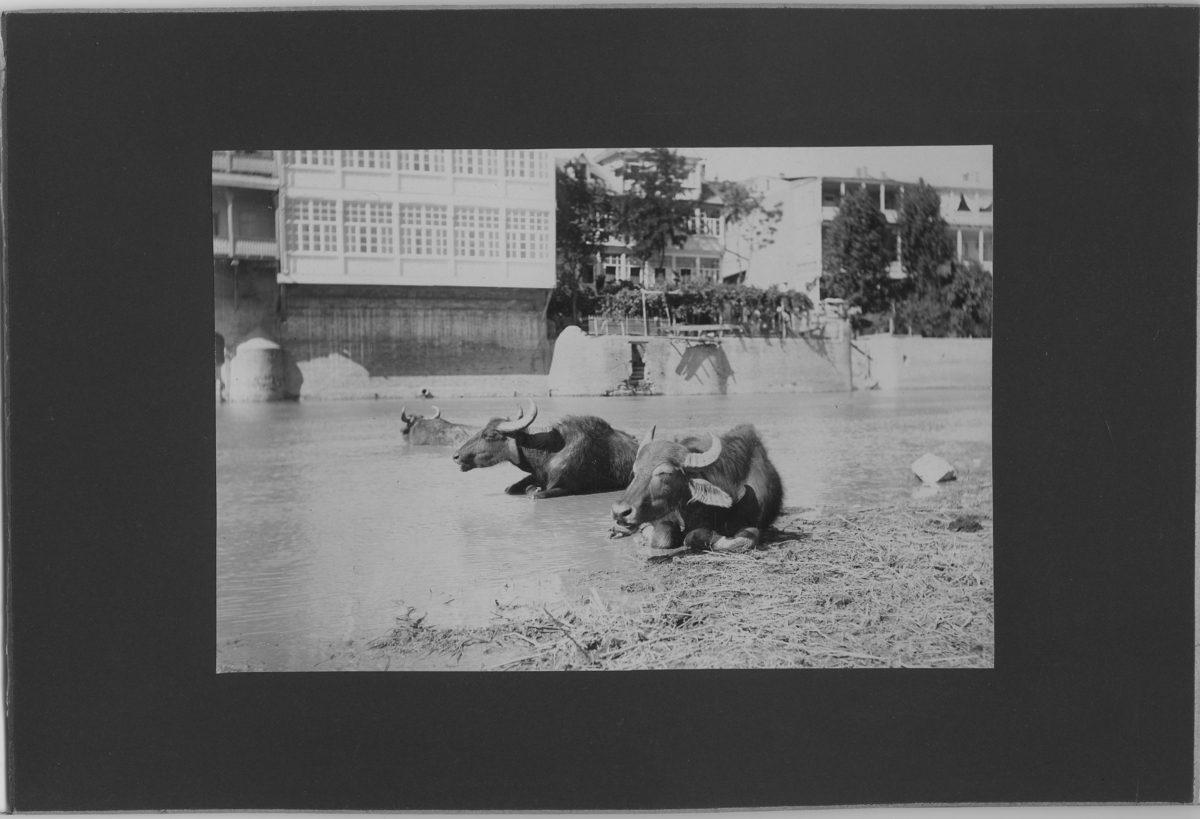3 vattenbufflar liggande i vatten (ev.flod) med hus på andra sidan.