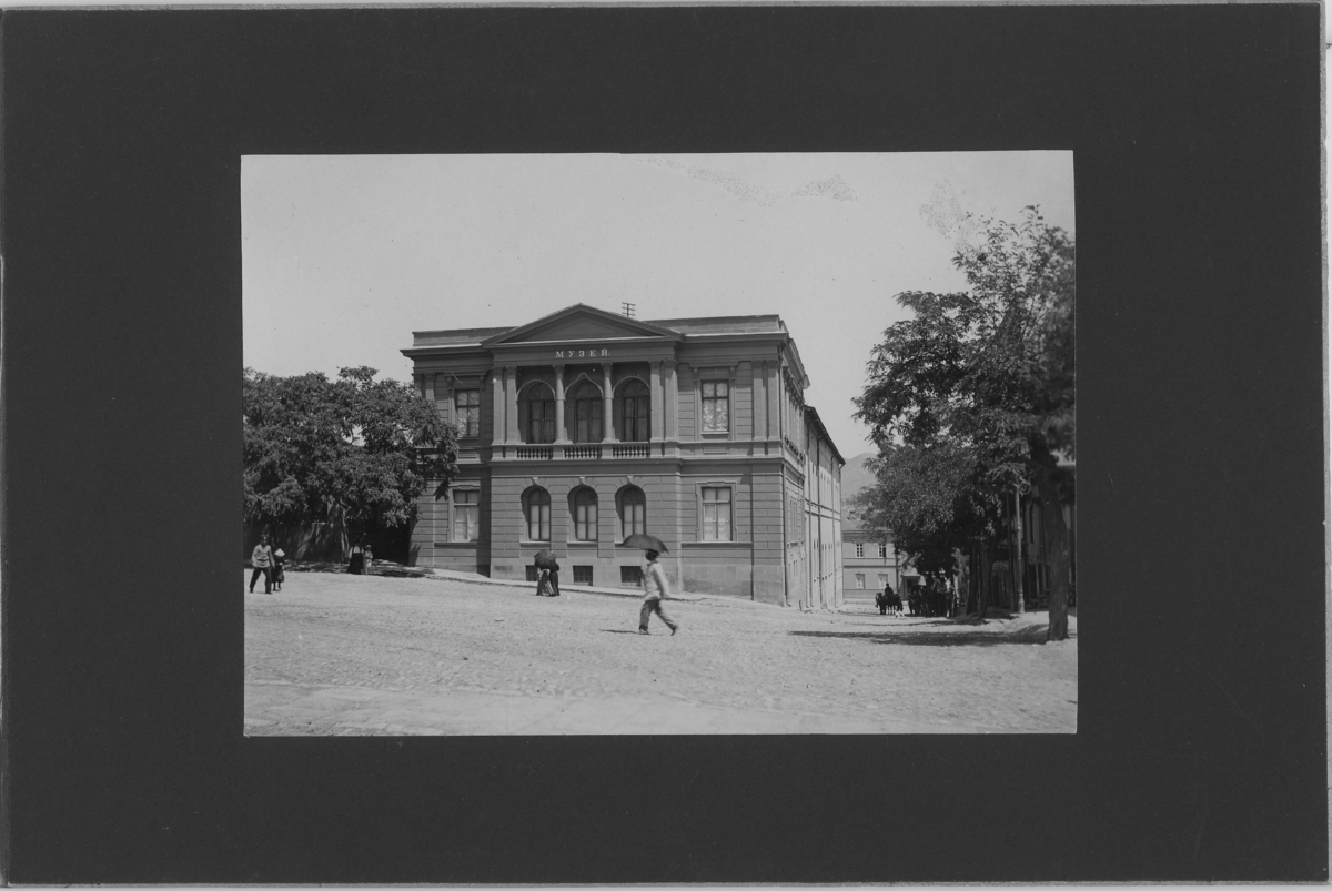 'Vy med stor byggnad och pgående människor framför. :: :: Se serie med fotonr. 5272:1-18. Serie fotonr 5269-5292, Stuxbergs resa till Kaukasien, 1897.'