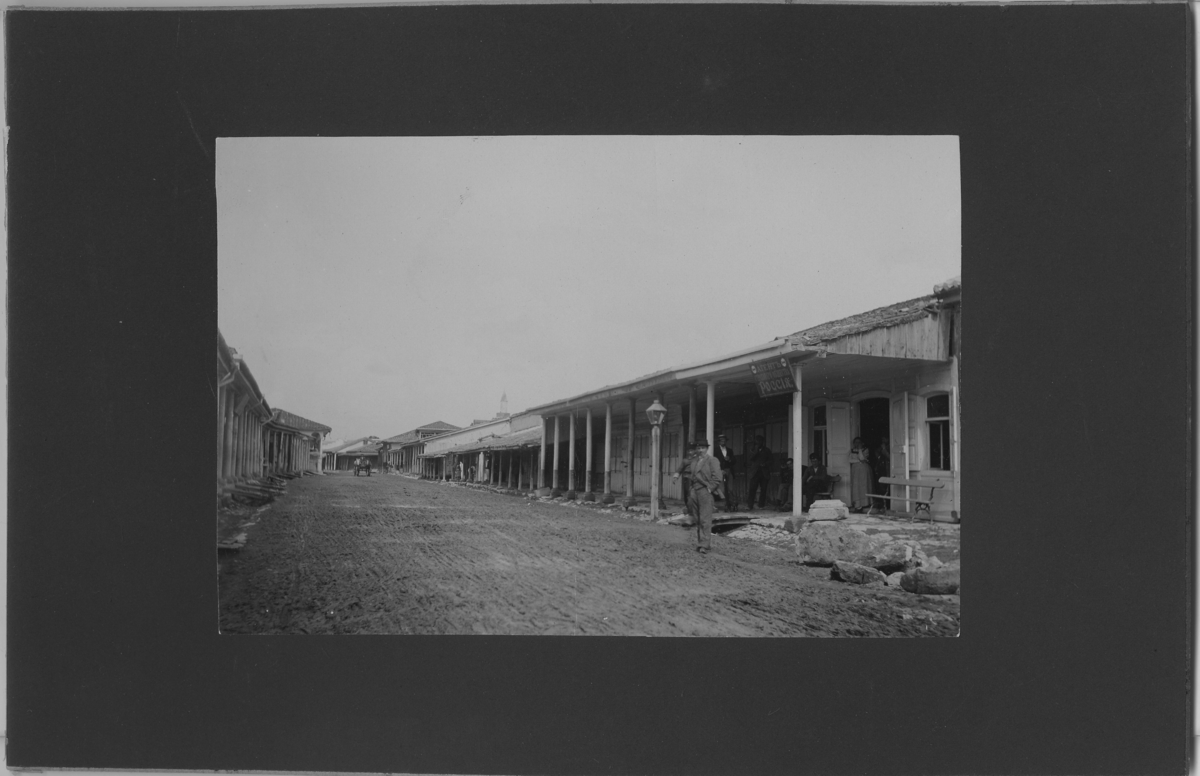 'Gatuvy med lerig grusväg med hus på sidorna, hus med trästöttor med utskjutande ta, verandor. Intill husen människor, män, kvinnor. På vägen kör en häst och vagn. :: :: Se serie med fotonr. 5273:1-17. Serie fotonr 5269-5292, Stuxbergs resa till Kaukasien, 1897.'