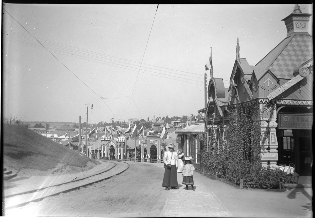 'Gatuvy med räls samt spång längs vägen där kvinnor och 1 flicka går. Vy med hus. Byggnadsstil. Kläder. Klädsel. :: :: Ingår i serie med fotonr. 5274:1-22. Se även fotonr. 5269-5292 med bilder från Stuxbergs resa till Kaukasien.'