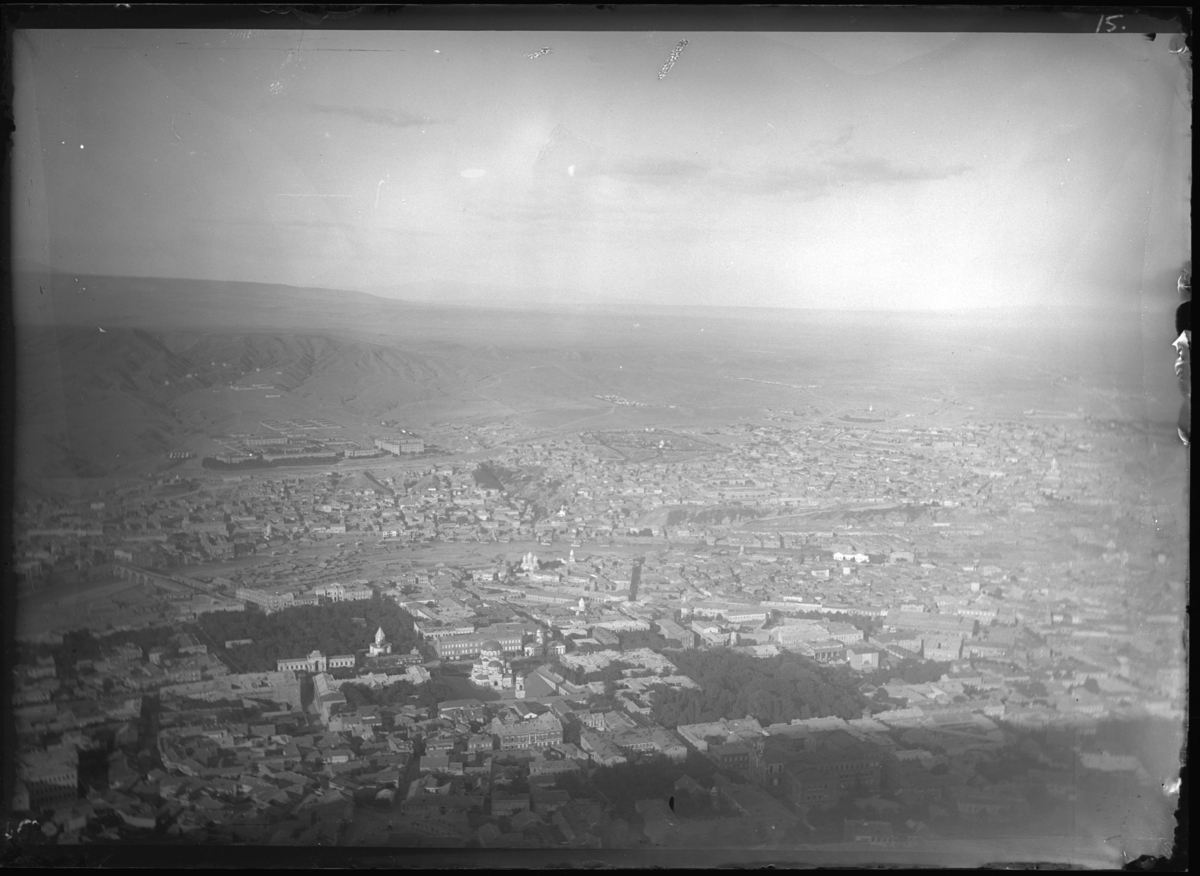 'Vy över stad med hus tagen från hög punkt, i fonden berg. :: :: Ingår i serie med fotonr. 5275:1-21. Se även fotonr. 5269-5292 med bilder från Stuxbergs resa till Kaukasien.'