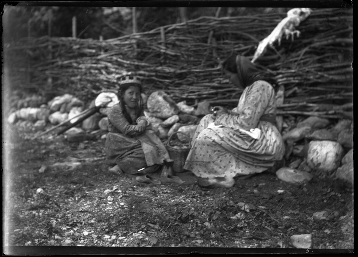 '1 kvinna och 1 flicka sittande på marken i färd med någon syssla, liten korg stående intill. Bakom dem hägnad av trä och i grunden stenmur. Kläder. Klädsel. Stengärdesgård. Hägnad. :: :: Ingår i serie med fotonr. 5276:1-20. Se även fotonr. 5269-5292 med bilder från Stuxbergs resa till Kaukasien.'
