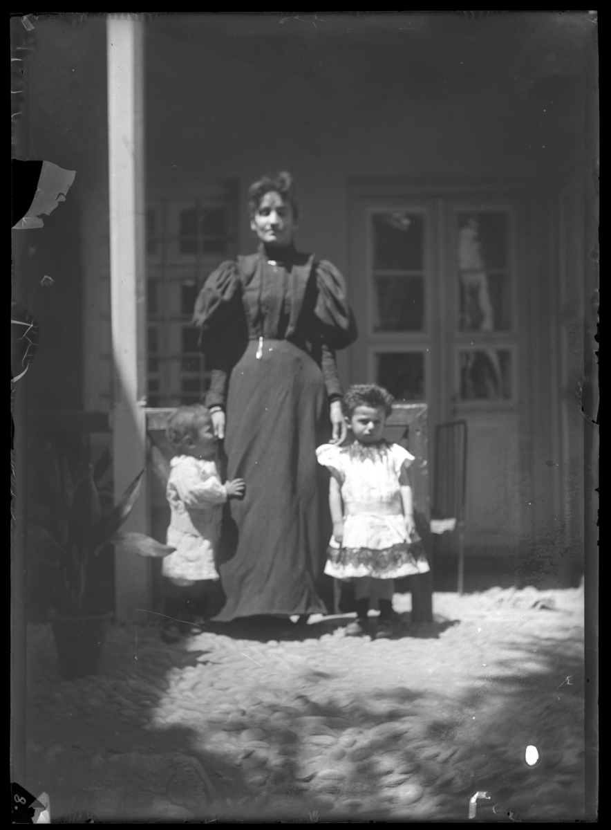 '1 kvinna med 2 små barn stående framför glasad dörr till hus. Kläder. Klädsel. Kullersten. Kruka. :: :: Ingår i serie med fotonr. 5277:1-19. Se även fotonr. 5269-5292 med bilder från Stuxbergs resa till Kaukasien.'