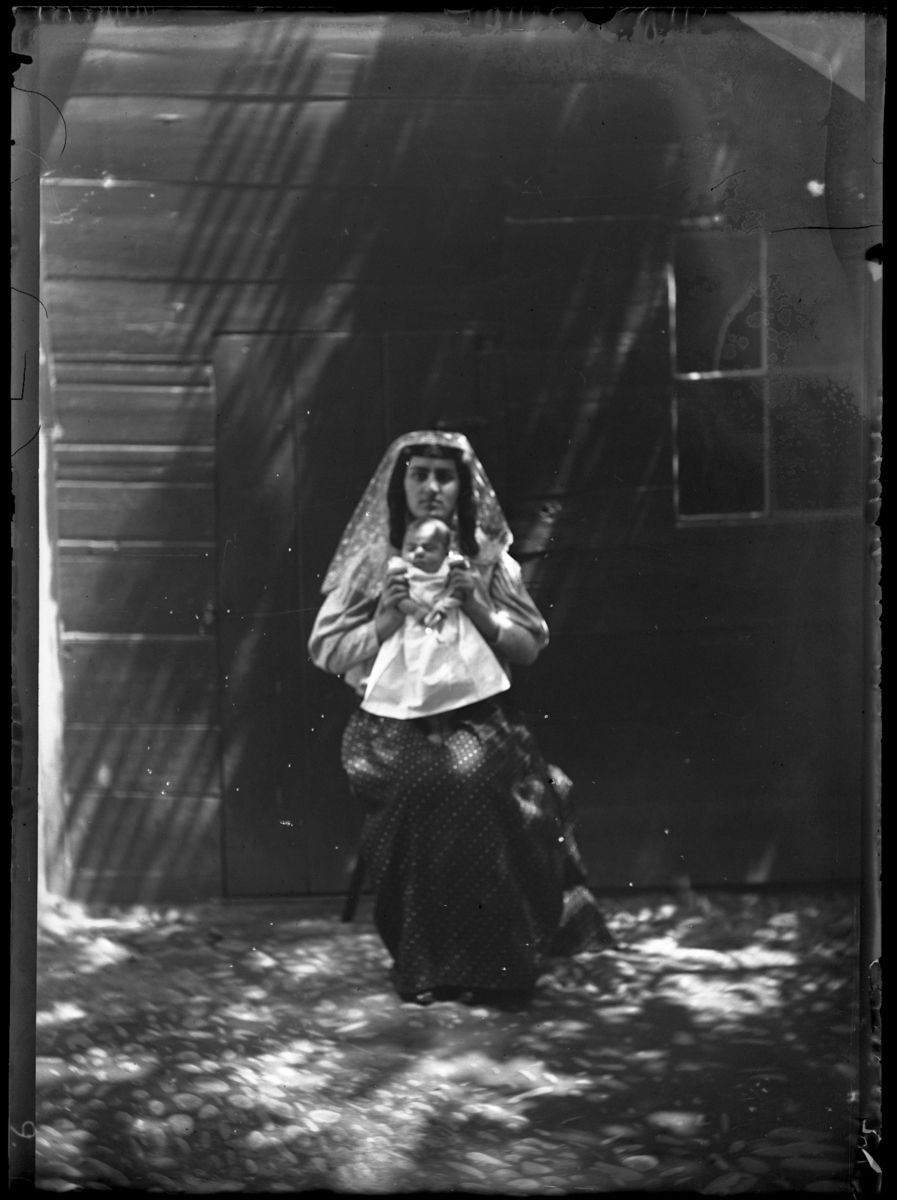 Titel: '1 kvinna håller upp sitt barn (bäbis, baby). Iklädd slöja, stående framför husvägg. Kläder. Klädsel. :: :: Ingår i serie med fotonr. 5277:1-19. Se även fotonr. 5269-5292 med bilder från Stuxbergs resa till Kaukasien. Fotonr. 5277:3, 9, 11 och 15 är troligen samma motiv.'