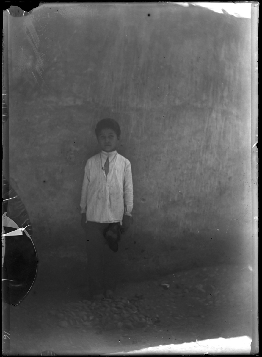 '1 pojke stående framför vägg. Kläder. Klädsel. :: :: Ingår i serie med fotonr. 5277:1-19. Se även fotonr. 5269-5292 med bilder från Stuxbergs resa till Kaukasien.'