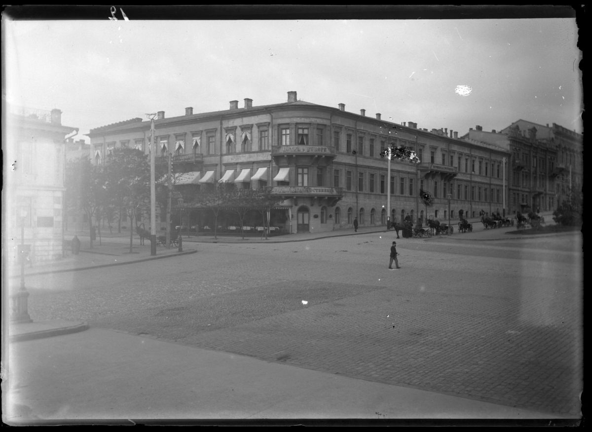 'Stadsvy med gata och ev. tork, stora hus längs kullerstenslagda gatan. Längs gatan rad med häst och vagn. På byggnaden skylt ''Hotel Europé''. Promenerande människor. Elstolpar eller telefonstolpar. :: :: Ingår i serie med fotonr. 5278:1-21. Se även fotonr. 5269-5292 med bilder från Stuxbergs resa till Kaukasien.'