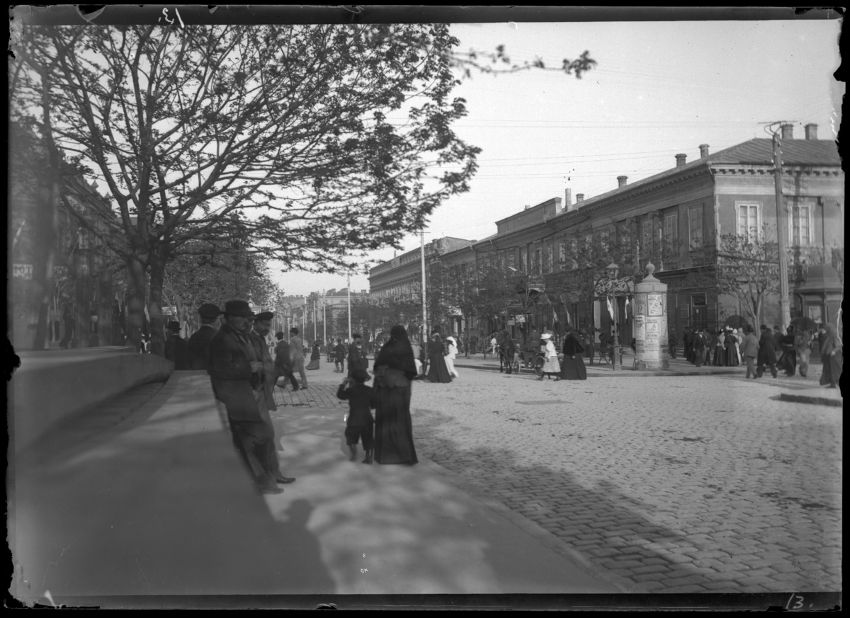 'Gatuvy med människor påå gatan med hus längs sidorna. Häst, vagn, elledning. Kläder. Klädsel. :: :: Ingår i serie med fotonr. 5278:1-21. Se även fotonr. 5269-5292 med bilder från Stuxbergs resa till Kaukasien.'