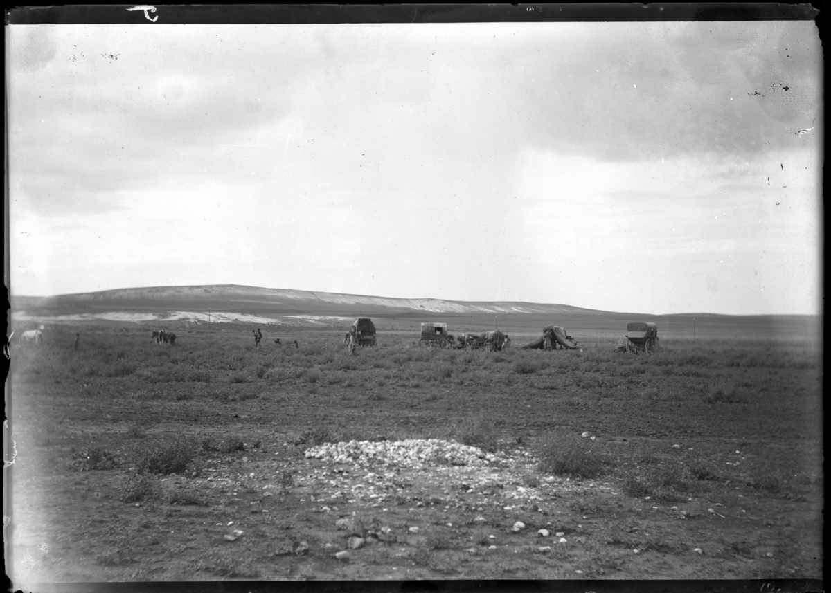 'Vy över öppet fält med lösgående hästar och en mindre grupp vagnar och några människor. Vagnarna övertäckta. :: :: Ingår i serie med fotonr. 5280:1-17. Se även fotonr. 5269-5292 med bilder från Stuxbergs resa till Kaukasien.'