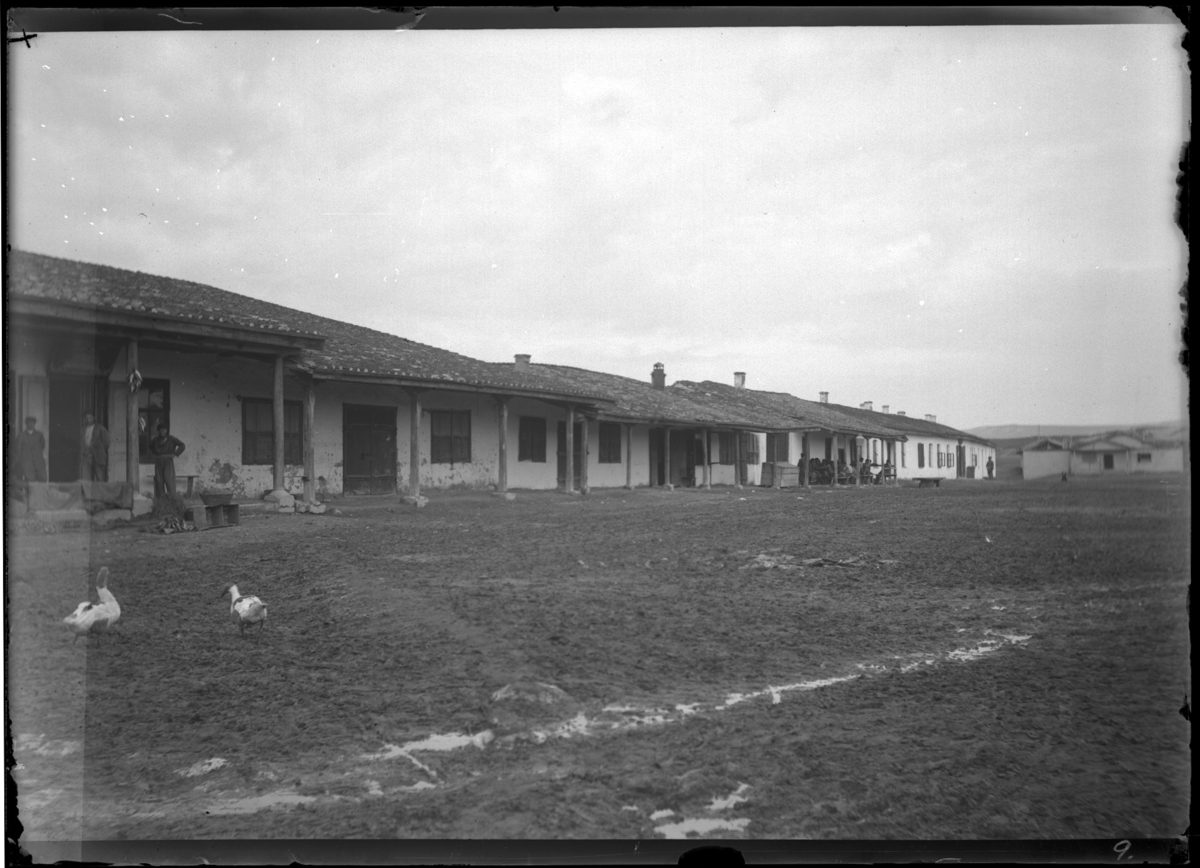 'Lång huslänga eller byggnad av annat slag, 3 män stående under utskjutande tak invid byggnaden. Gäss på gården framför. På avstånd syns en grupp människor sittande vid bord utanför byggnaden. :: :: Ingår i serie med fotonr. 5282:1-15. Se även fotonr. 5269-5292 med bilder från Stuxbergs resa till Kaukasien.'