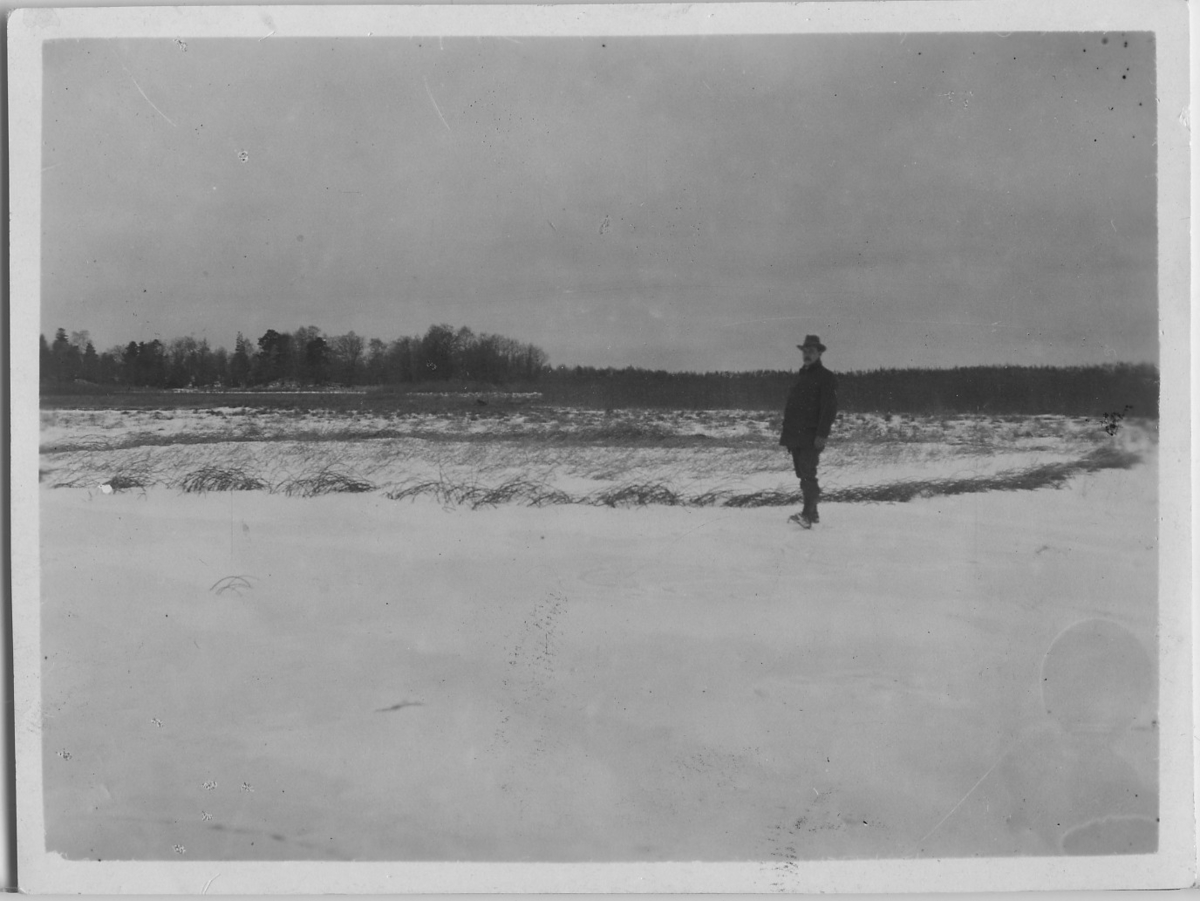 'Bilder från Hornborgasjön från: R. Söderberg: '' Hornborgasjön och dess fornsjöområde'' Del I 1932. :: :: En man ståendes intill en cireklformig sävdunge, visande dess utvecklig från rizomet i mitten. Sjösänkning. :: :: Ingår i serie med fotonr. 4245:1-35.'