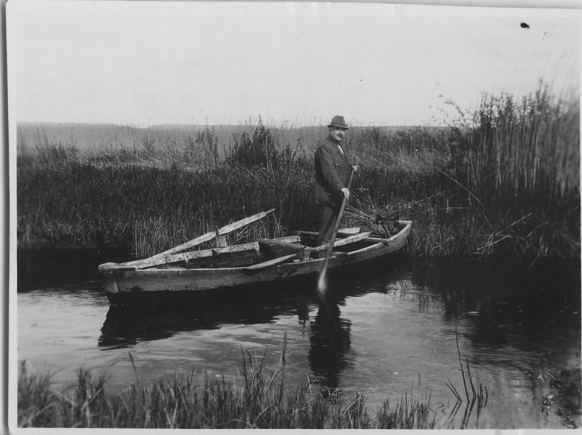 'Bilder från Hornborgasjön från: R. Söderberg: '' Hornborgasjön och dess fornsjöområde'' Del I 1932. :: :: en man ståedens i en roddbåt i en muddrignsränna efter Hornborgasjöns sista sänkning. Sjösänkning. :: :: Ingår i serie med fotonr. 4245:1-35.'