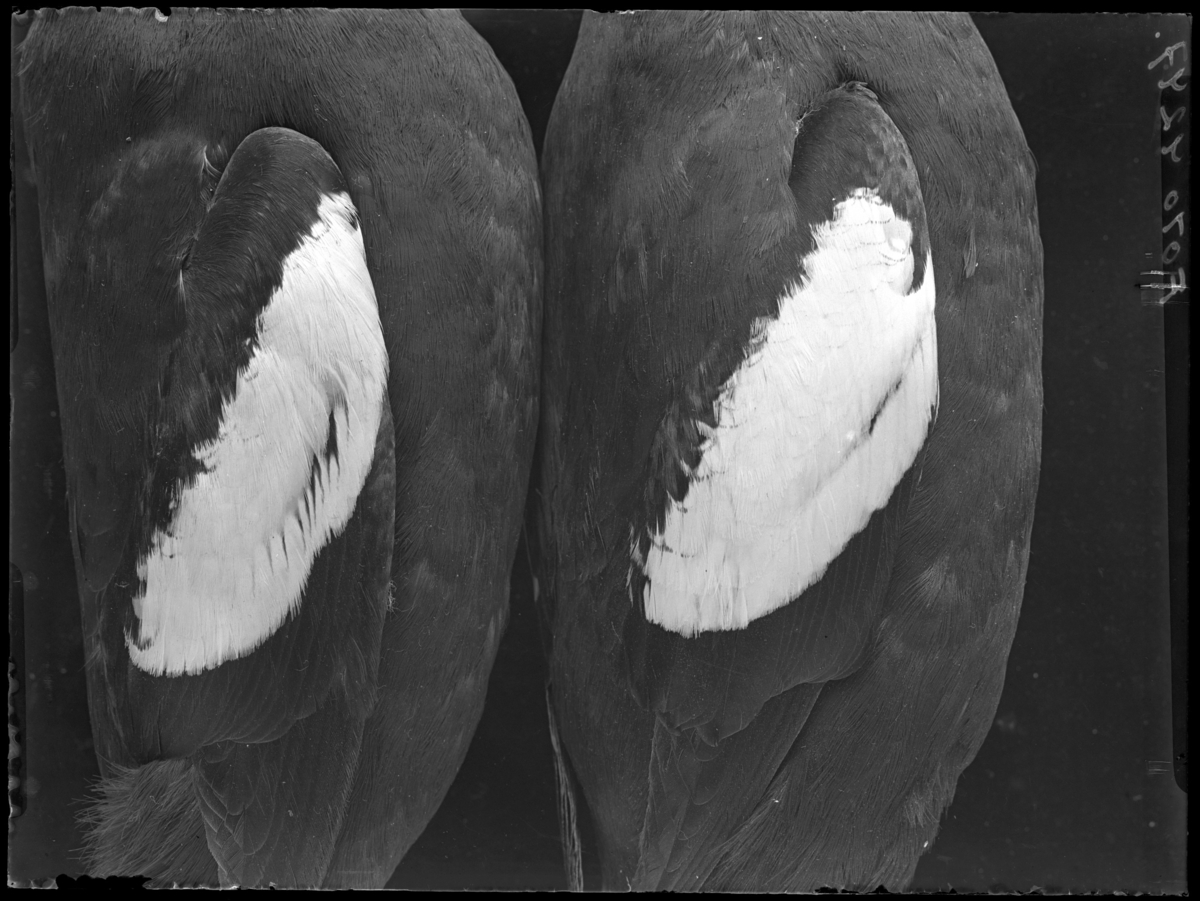 'Den högra vingen är Av.su. 2791: vänstervinge av Tobisgrissla, hona. Fynddatum: 1906-03-19. :: :: Den vänstra vingen på bilden är Av.su. 5355:vinge av hane.'