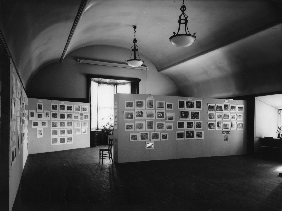 'Utställning av naturfotografier på Naturhistoriska museet, i nuvarande biblioteket. :: Utställningsskärmar med uppsatta fotografier. Taklampor. Stol. :: :: Se även fotonr. 4304:1.'