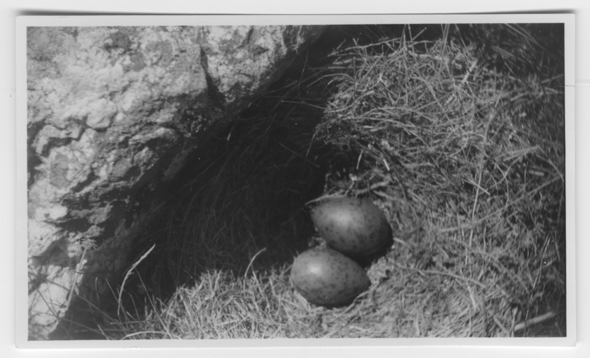 'Bo med 2 nyvärpta ägg i ett måsbo. Boet intill berghäll. :: :: Ingår i serie med fotonr. 4401-4440.'