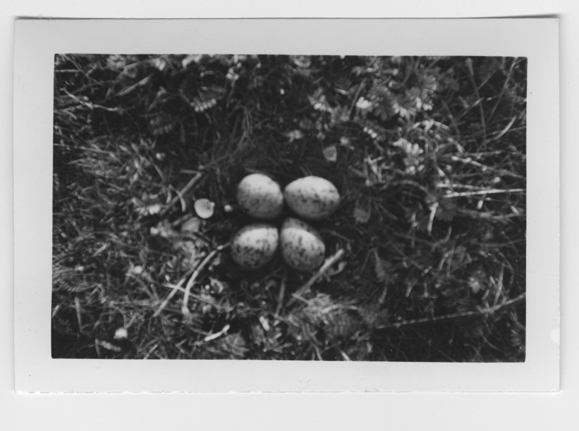 '4 ägg av strandskata i bo. Oskarp bild. :: :: Text på baksidan av fotot: ''Strandskatans bo med 4 st ca 10 dagar ruvade ägg. Som synes av bilden, har honan dekorerat reden med snäckor. Boet låg på gräsholmen, där skärfläckkolonin bestod av 9 par enligt uppgift från ingengör F. Reuterwall, Varberg, som har överinseende av Getteröns fåglar.'' :: :: Ingår i serie med fotonr. 4544:1-35.'
