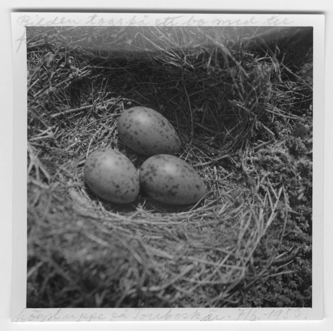 'Bo med 3 ägg av havstrut. :: :: Text på fotot: ''Bilden togs på ett bo med 3 st fullruvade ägg av havstruten. Fotot togs på 50 cm avstånd högst upp på Tollboskär.'' :: :: Ingår i serie med fotonr. 4545:1-34.'