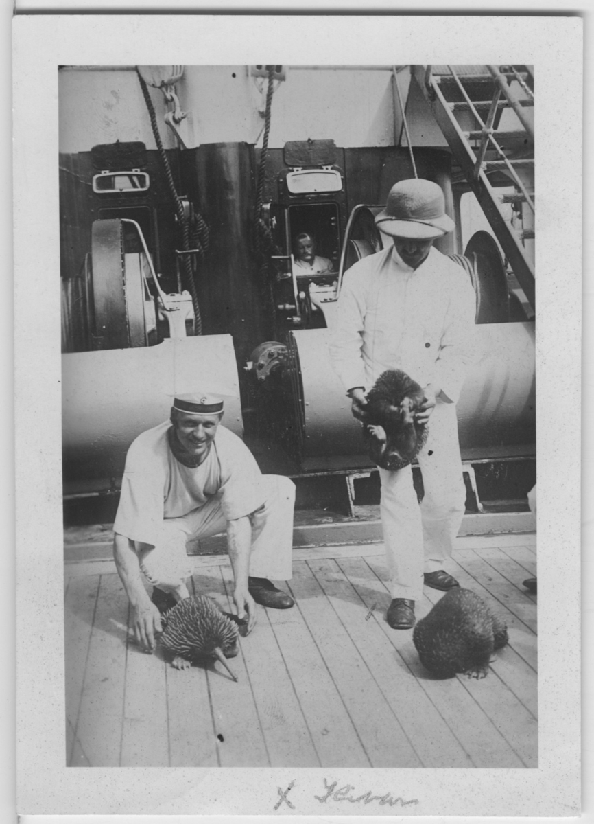 '''P.S. Ägaren själv med djuren ss. ungar importerad (1912).'' 2 män och 3 långnäbbade myrpiggsvin, levande. På båtdäck? Fynddatum: 1912-00-00. :: Coll.an.7490. :: :: Djuret finns utställt som montage i monterskåp nr. 33 i däggdjurssalen på Göteborgs Naturhistoriska Museum. :: :: Se även fotonr. 4548:2.'