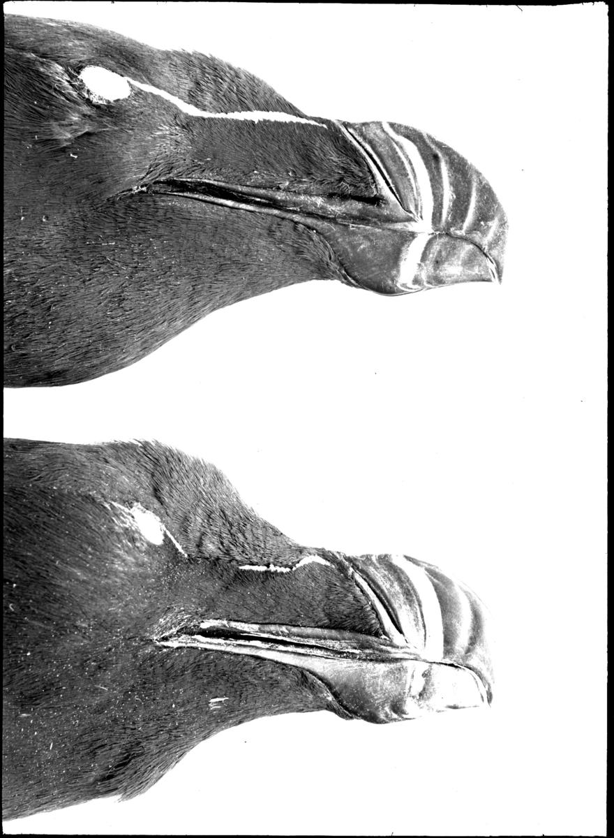 'Detaljbild av 2 tordmular med näbb och del av huvud sedda från sidan. Ur F.Salomonsen:The Atlantic Alcidae,s.22 :: :: Se fotonr. 4683-4686.'