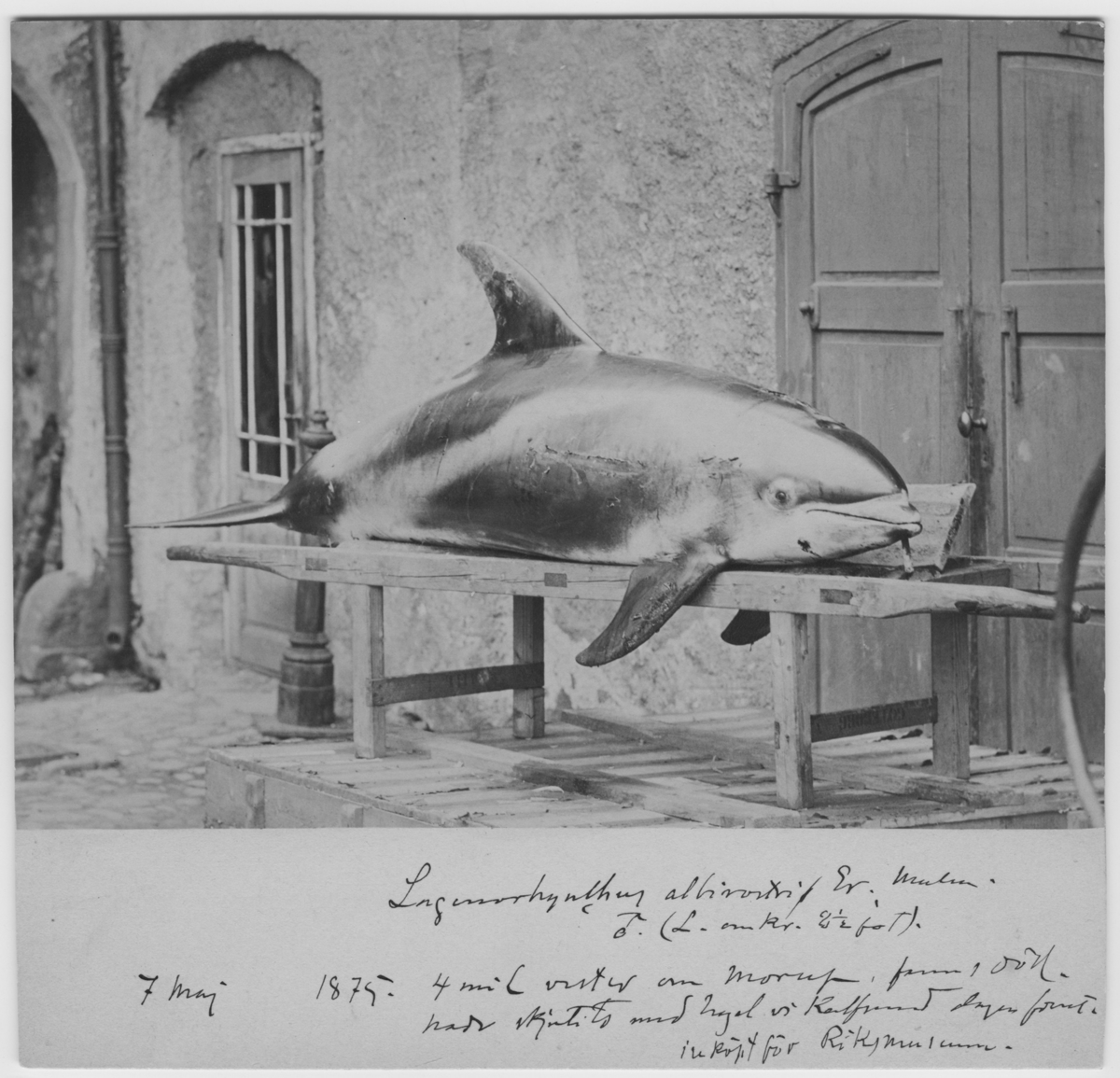 'Vitnosdelfin liggande på träbänk utanför byggnad, sedd snett framifrån. Den ligger på en träbänk utanför port, ev. Ostindiska huset. Text på fotot: hona, ca 2,5 fot lång, Funnen 1875-05-07 4 mil väster om Morup, funnen död, skjuten dagen innan vid Kalvsund, inköpt för Riksmuseum.'' :: :: Se även fotonr. 4788:2.'