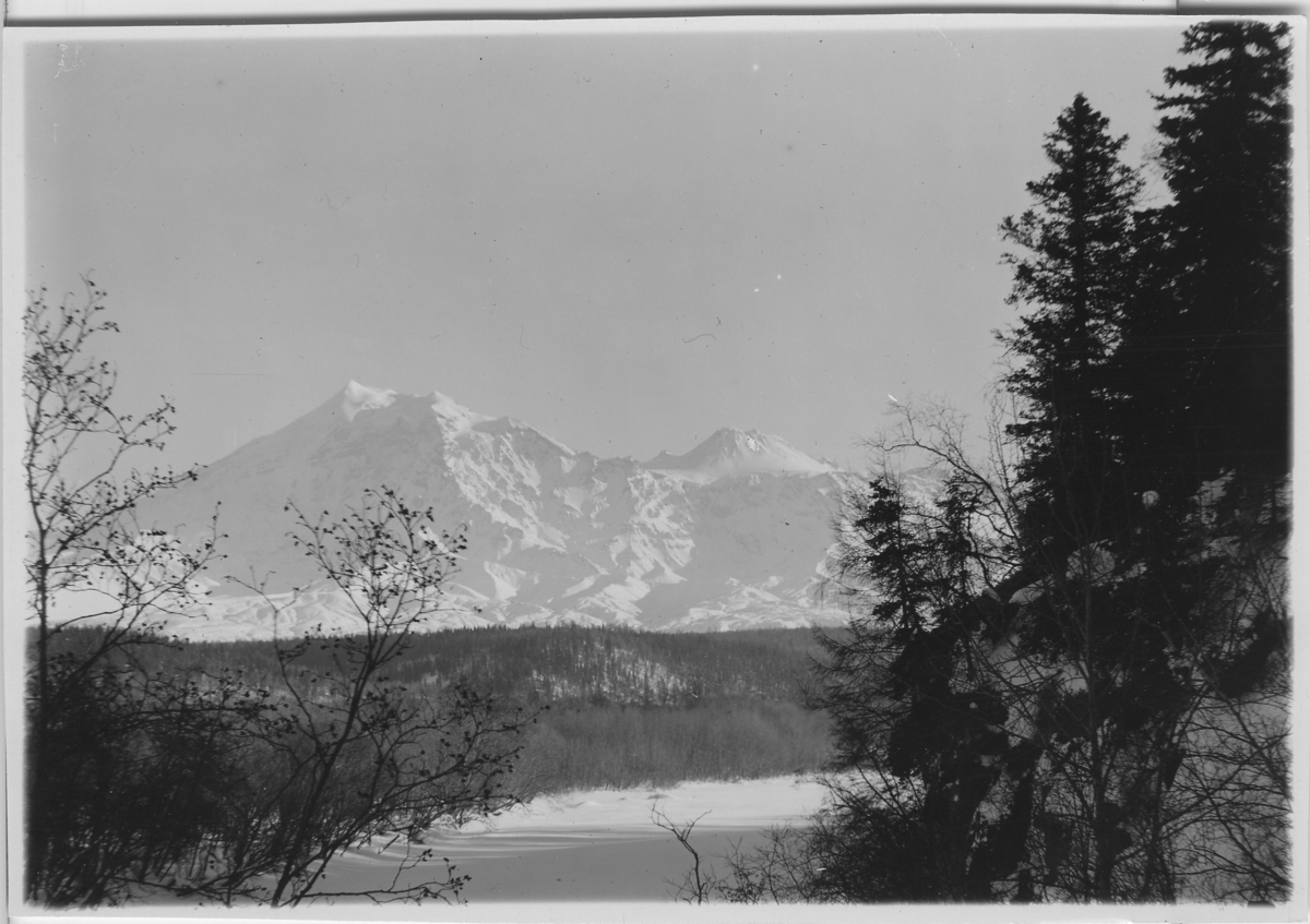 'Vulkanen Schivelutch (1) :: från byn Jelovka. :: Vy mot vulkanen med älv i förgrunden. :: :: Serie fotonr 4916-4930. :: Kartskiss fotonr. 4916:1 visar motivens läge.'