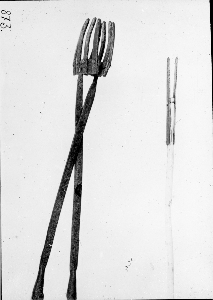 'Bildtext: ''Saxtång och pinntång. Från Julius d´Auligné, Lagan, Laholm. Inköpt av Göteborgs museums historiska avdelning.'' Närbild. :: :: Ingår i serie med fotonr. 5118:1-6. Se även fotonr. 2869 för papperskopia.'