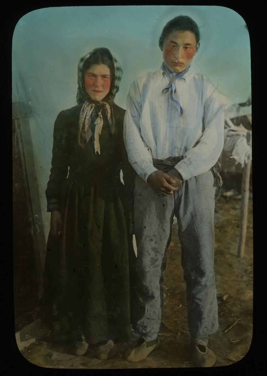 '1 gift par, inuiter (eskimåer), Christian Esquinieaux och hans fru. Text på på glaset: ''Christian Esquinieaux and his wife.'' Kläder. Klädsel. :: :: Ingår i serie med fotonr. 5203:1-22. Se även hela fotonr. 5202-5218 med bilder från Frits Johansen.'