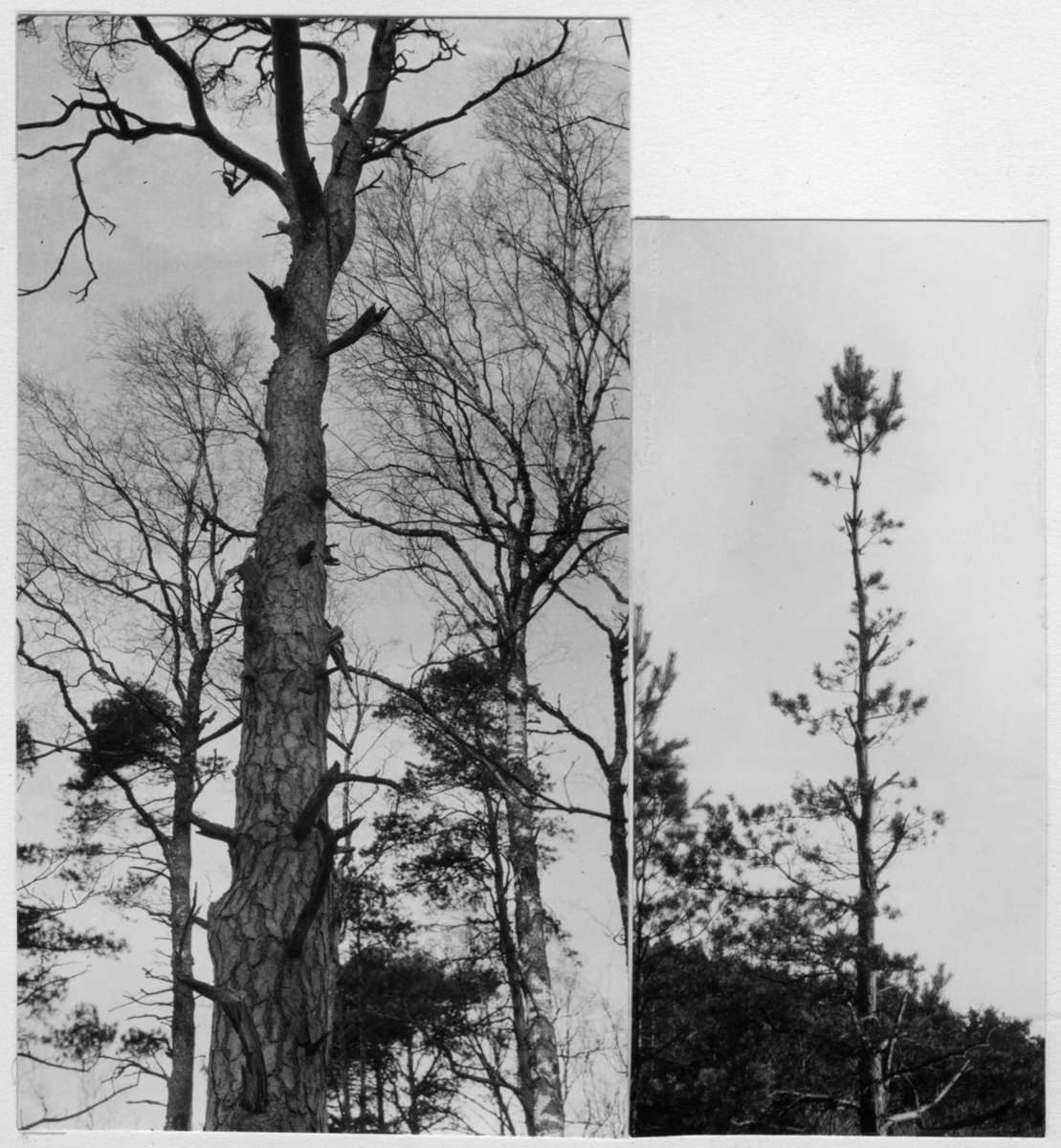 'Bildtext: ''Olovlig täkt av tallgrenar till bränsle och av tallris till rumsprydnad.'' Närbilder på tallstam och talltopp. :: :: Fotonr. 7048:1-26 indelad under rubriken ''Däggdjur, Människor''. Ingår i serie med fotonr. 7046:1-383, 7047:1-33 och 7048:1-67 med bilder från Länsjägmästare John Lindners bildarkiv.'