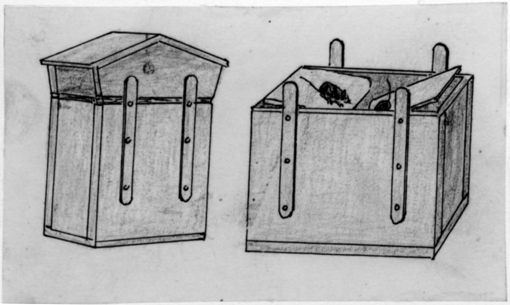 'Bildtext: ''Fälla för sorkar och råttor.'' Teckning, skiss av fälla, fångstanordning. :: :: Fotonr. 7048:59-66 indelad under rubriken ''Jakt och djurfångst, jaktbytets behandling''. Ingår i serie med fotonr. 7046:1-383, 7047:1-33 och 7048:1-67 med bilder från Länsjägmästare John Lindners bildarkiv.'