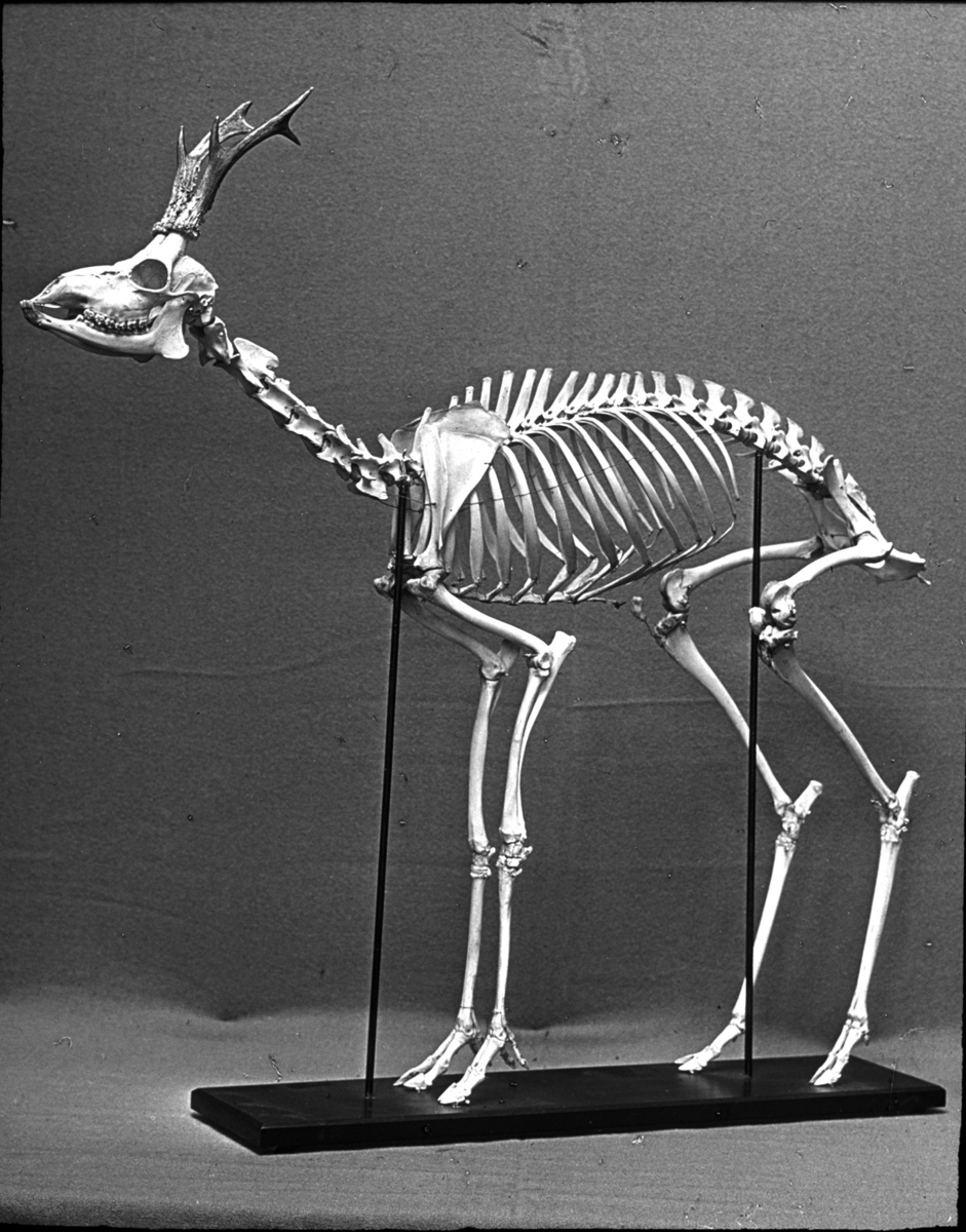 'Skelett av rådjur, sett från sidan. :: :: Från Dr. Schlüter & Mass, Halle a S naturvetens. Läromedel. Numrerade Serie I.A. Nr 1-30. :: :: Ingår i serie med fotonr. 5374:1-30. Se även hela fotoserien 5374-5376.'