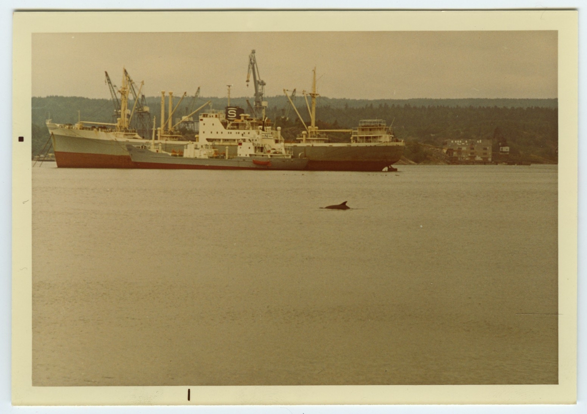 'Vitsiding i vattnet framför stora fartyg. I fonden barrskog. :: :: Ingår i serie med fotonr. 5604:1-4-'