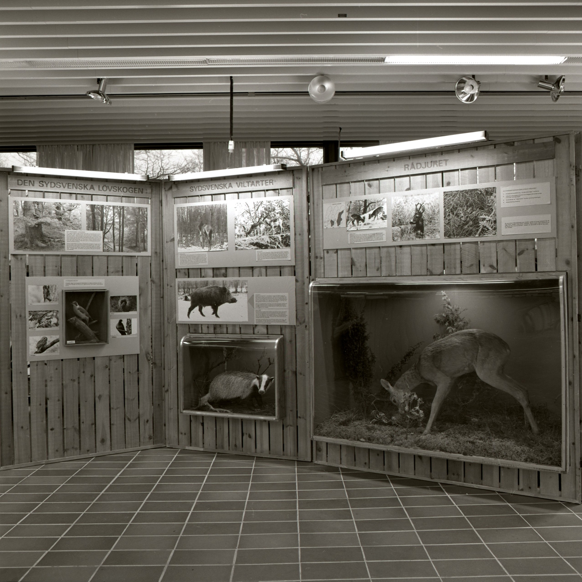 'Utställningen '' Viltet genom 150 år'' från Riksmuseet: :: :: Utställningsskärmar med bilder och texter samt monterade djur med rubriker ''Den sydsvenska lövskogen'', ''Sydsvenska viltarter'' och ''Rådjuret''. Monterat rådjur samt grävling. :: :: Ingår i serie med fotonr. 5796:1-12.'