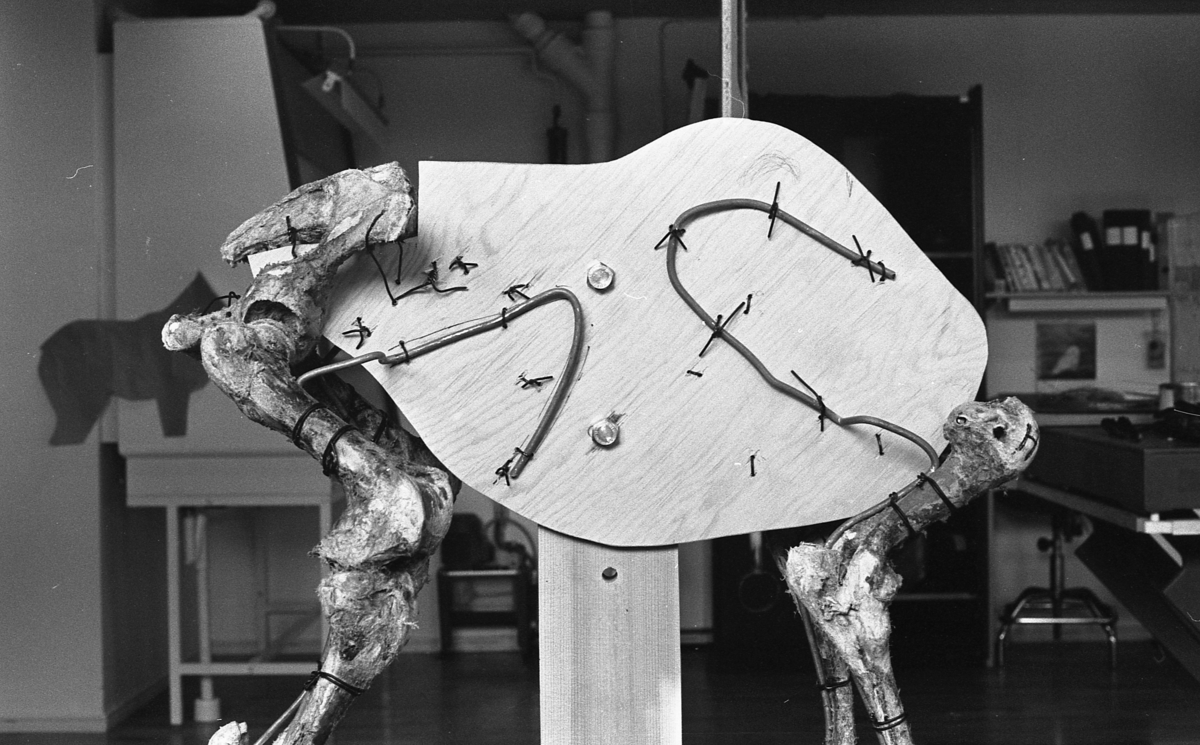 'Montering av föl: :: Grundstommen till fölmontaget, med centralbräda och extremitetben. :: :: Fölet fött 1982-07-25, död 1982-07-26 i Slottsskogen. Montaget utfört av Jeanette Setterberg finns utställt i däggdjurssalen i monterskåp nr 62 (2007-01-14). :: :: Coll.an. 14334. :: :: Ingår i serie med fotonr. 5817.'