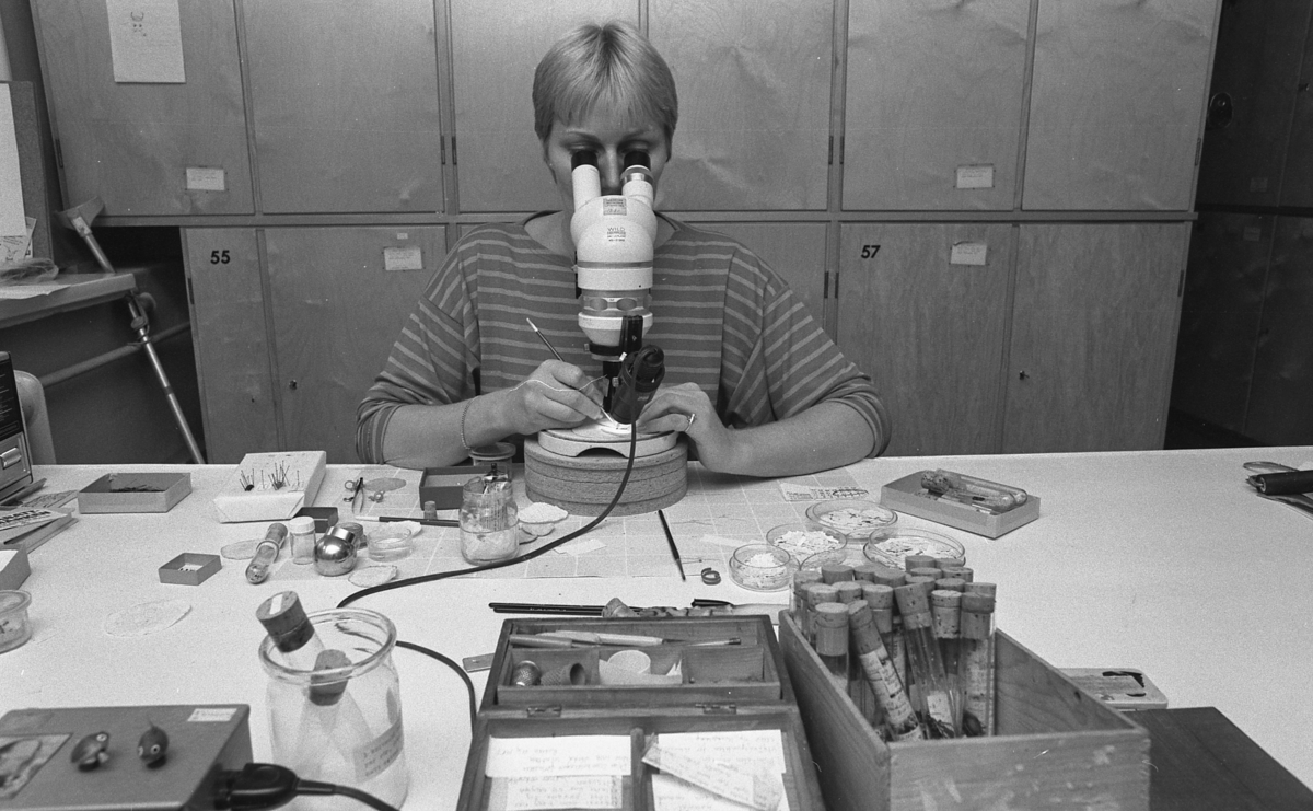 'Entomologen: Barbara Landelius i arbete med montering av insekter: :: :: Insektsmontering. Barbara sittande vid skrivbord med mikroskop, på bordet korkade provrör med preparat.I bakgrunden träskåp. :: :: Ingår i serie med fotonr. 5976:1-6, se även fotonr. 5977:1-4.'