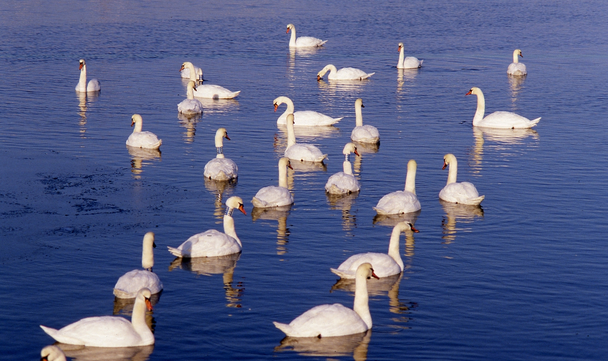 'Svanmärkning vid Ringhals kärnkraftverk: :: :: Vy med simmande knölsvanar i vattnet. Några svanar med fågelmärkningsring kring halsen. :: :: Se även fotonr 5997.'