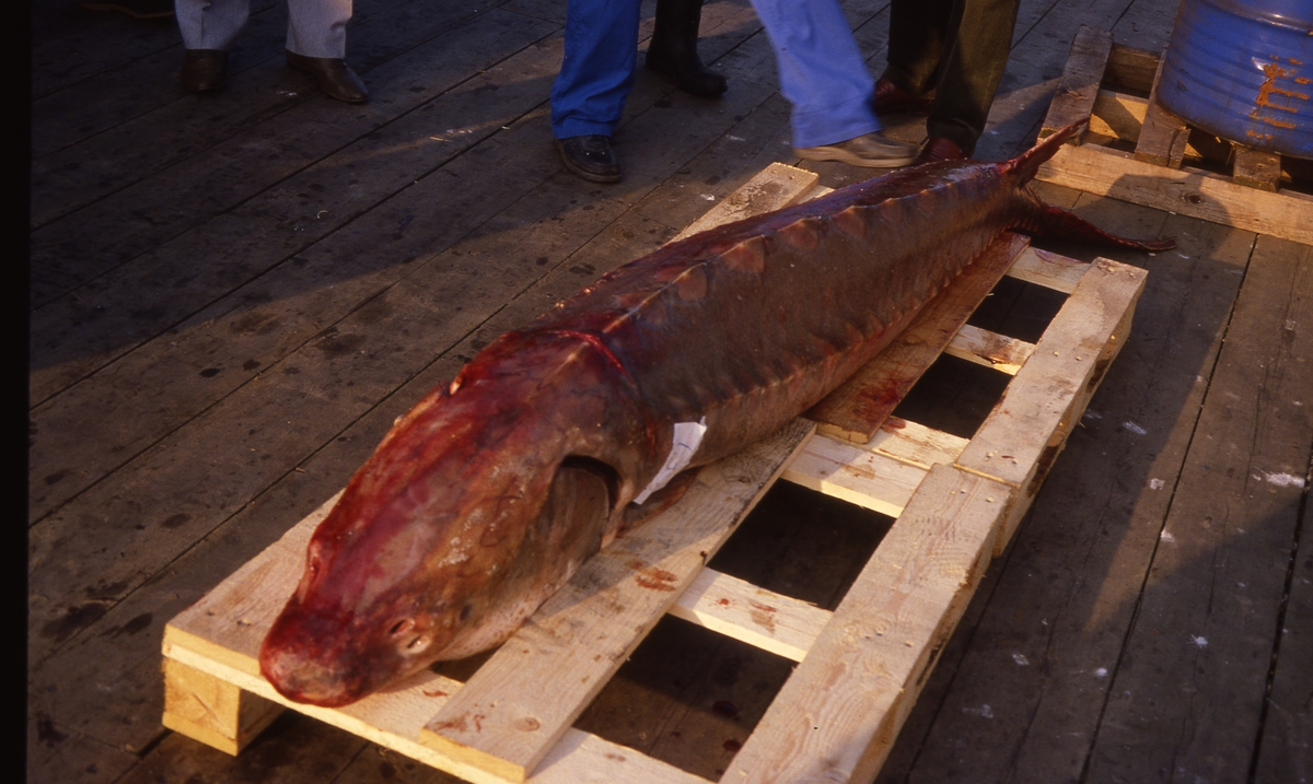 'Stör fångad i Nordsjön: :: :: Helbild, stören liggande på träpall, sedd framifrån. Huvud med skäggtömmar. Längsgående rader med pansarliknande benplattor synliga. :: :: Ingår i serie med fotonr. 6029:1-12. Se även fotonr. 6028.'