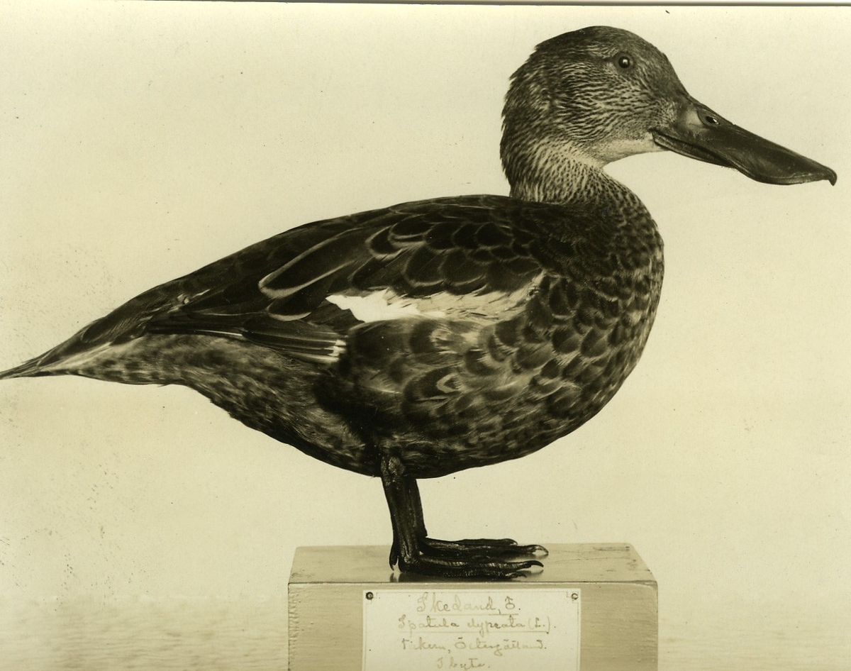 'Skedand, hane, särskilt märklig eftersom den inte har en enda fjäder av vinterdräkten kvar. Fynddatum: 1918-08-02. :: :: Montaget finns i monterskåp nr. 266 i fågelgången på Göteborgs Naturhistoriska Museum (2008-02-06). :: :: Bilden med i Göteborgs Naturhistoriska museums Årstryck 1920 s.37'
