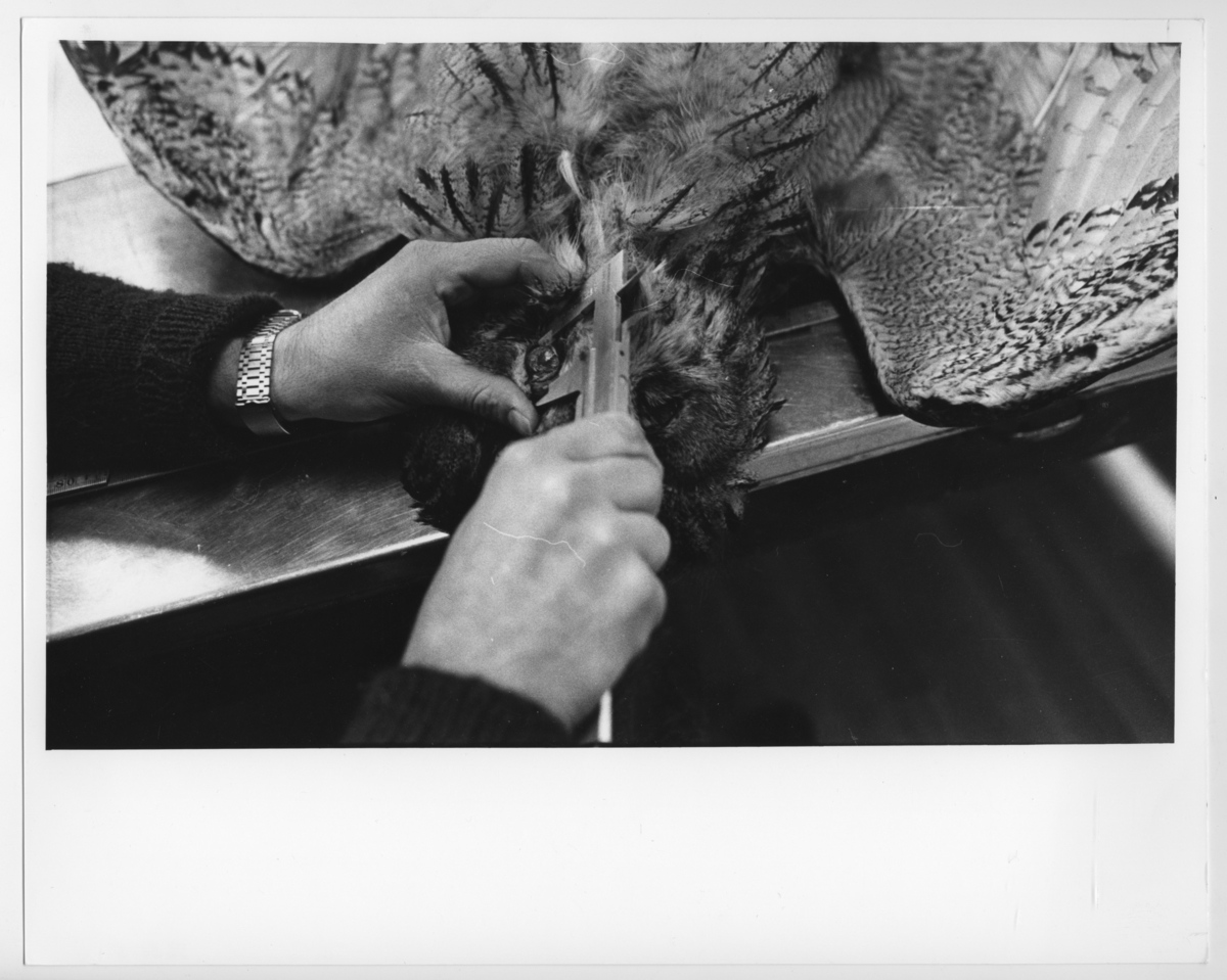 'Mätning av berguvar i ateljén, mätning av öga med mätinstrument. :: :: Ingår i seri emed fotonr. 5651:1-13.'