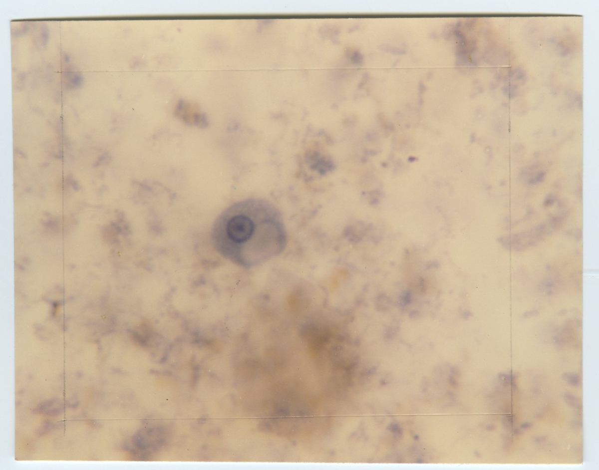 'Mikroskopbilder på amöba: :: Text på baksidan av fotot: ''Uninucleate Entamoeba histologica cyst. The nucleus is typical, and vacuole is present x 2000. 11515-1.45'' :: :: Ingår i serie med fotonr. 5653:1-16.'