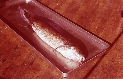 'Bilder en död lungfisk från akvariet. Avgjuten och placerad i basutställningen på Göteborgs Naturhistoriska museum, 1960. Avgjutningen gjord av Björn Wennerberg. :: :: Fotograferad på en bricka på ett bord.'