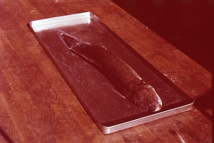 'Bilder en död lungfisk från akvariet. Avgjuten och placerad i basutställningen på Göteborgs Naturhistoriska museum, 1960. Avgjutningen gjord av Björn Wennerberg. :: :: Fotograferad på en bricka på ett bord. Ryggsidan synlig.'