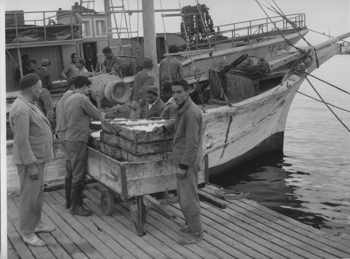'ca 14 män på brygga vid båtar. Kärra med upptagen fångst. ''Trålfiskare tar i land sin fångst av fisk och tvättsvamp vid hamnen i Sfax.'' På baksidan står ''N 31- Chalutiers débarquant au port de SFAX sa production poissons et éponges.'' :: :: Ingår i serie 5671:1-12 varav vissa bilder finns i basutställningen.'