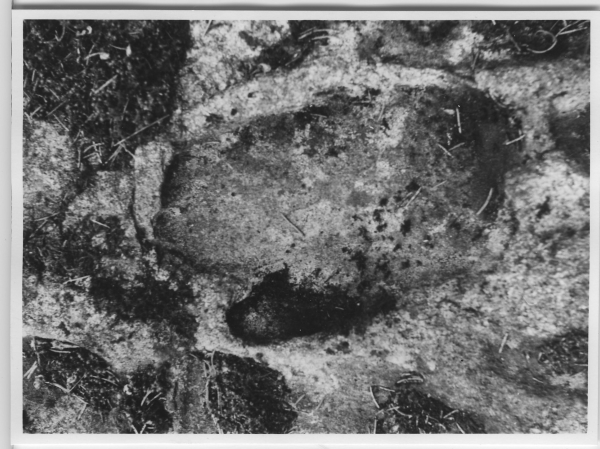 Närbilder på häll. Vittringsformer.Rektangelformad bit av basalt (troligen) i berghäll.