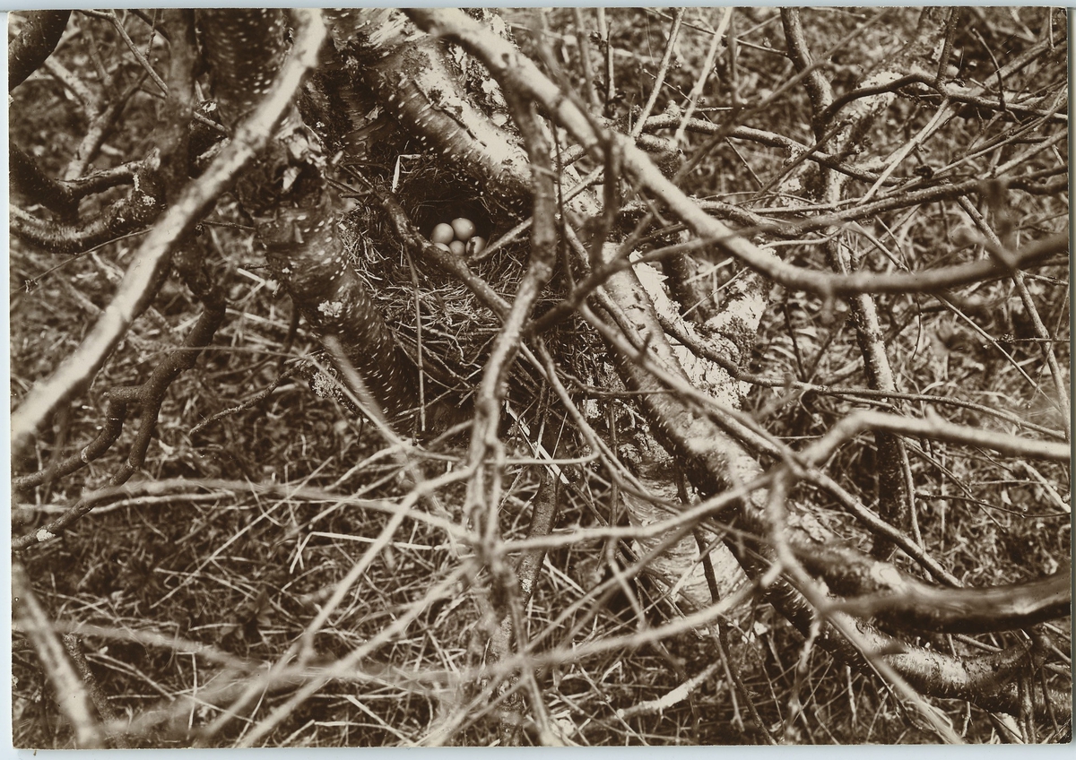 'Järnsparv, bo med ca 5 st ägg, invid björkstam, sett ovanifrån. :: :: Se även fotonr. 14.'