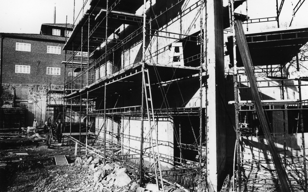 'Tillbyggnaden av Göteborgs Naturhistoriska Museum april 1979. Byggarbetsplatsen södra Göteborgs Naturhistoriska Museum, yttervägg börjar ta form, byggnadsarbetare. :: :: Ingår i serie med fotonr. 5527:69-216.'