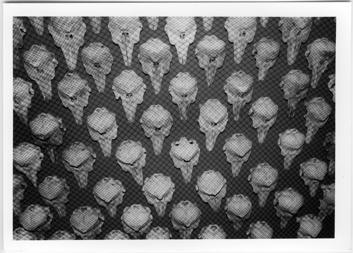 'Närbild på ett antal tumlarskallar, kranier, bakom nät. :: :: (Se även ev. fotonr. 6765, bilder från valutställningen, dessa kan höra ihop med detta fotonr.) :: :: Ingår i serie med fotonr. 7088:1-18.'