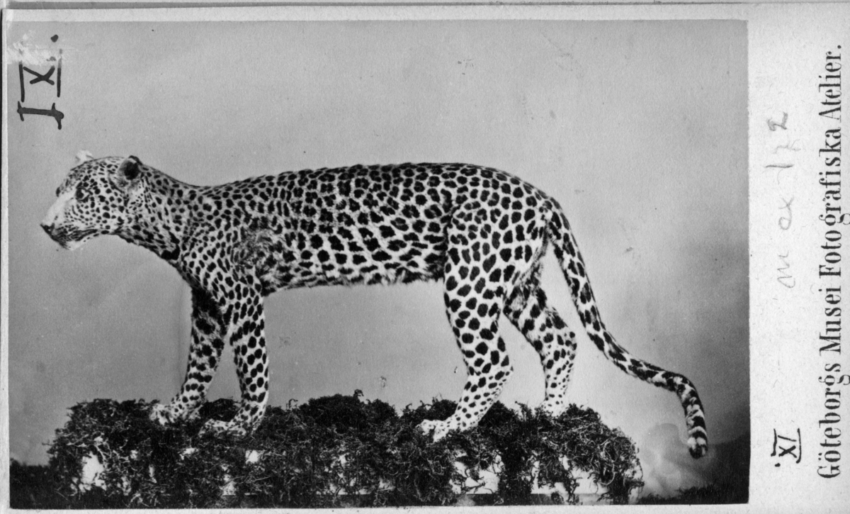 'Monterad leopard (panter) sedd från sidan. :: :: Text till bilden: ''Leoparden eller pantern. Då amerika blifvit beskärdt med den der frukatde jaguaren och Asien med kungstigern, har Afrika på sin lott ock erhållit en stor gul-svartbrokig, större kattart, eller pantern, men den sistnämda finnes ock i Asien äfvensom på Java och Sumatra. Pantern å dessa öar är i allmänhet mörkbruk med svarta fläckar, men torde likväl endast vara en lokalvarietet af den vanliga. Till lefnadssätt liknar han mycket de nyssnämda, stora kattarterna och skiljes lätt ifrån jaguaren derigenom, att fältet inom den svarta ringfläcken är utan midtfläck. Afbildningen är tagen efter ett djur från södra Afrika.'' /August Wilhelm Malm år 1866. :: :: Serie med fotonr. 7079:1-37. Fotografierna är monterade i en liten bok, inbunden, med titel ''Fotografier öfer Däggdjur och foglar. Texter av A. W (1866). Malm. Boken återfinns i Göteborgs Naturhistoriska Museums bibliotekssamling under ''Äldretryck''. På baksidan av varje foto finns en text om arten. :: :: Se även fotonr. 5693:1-4.'